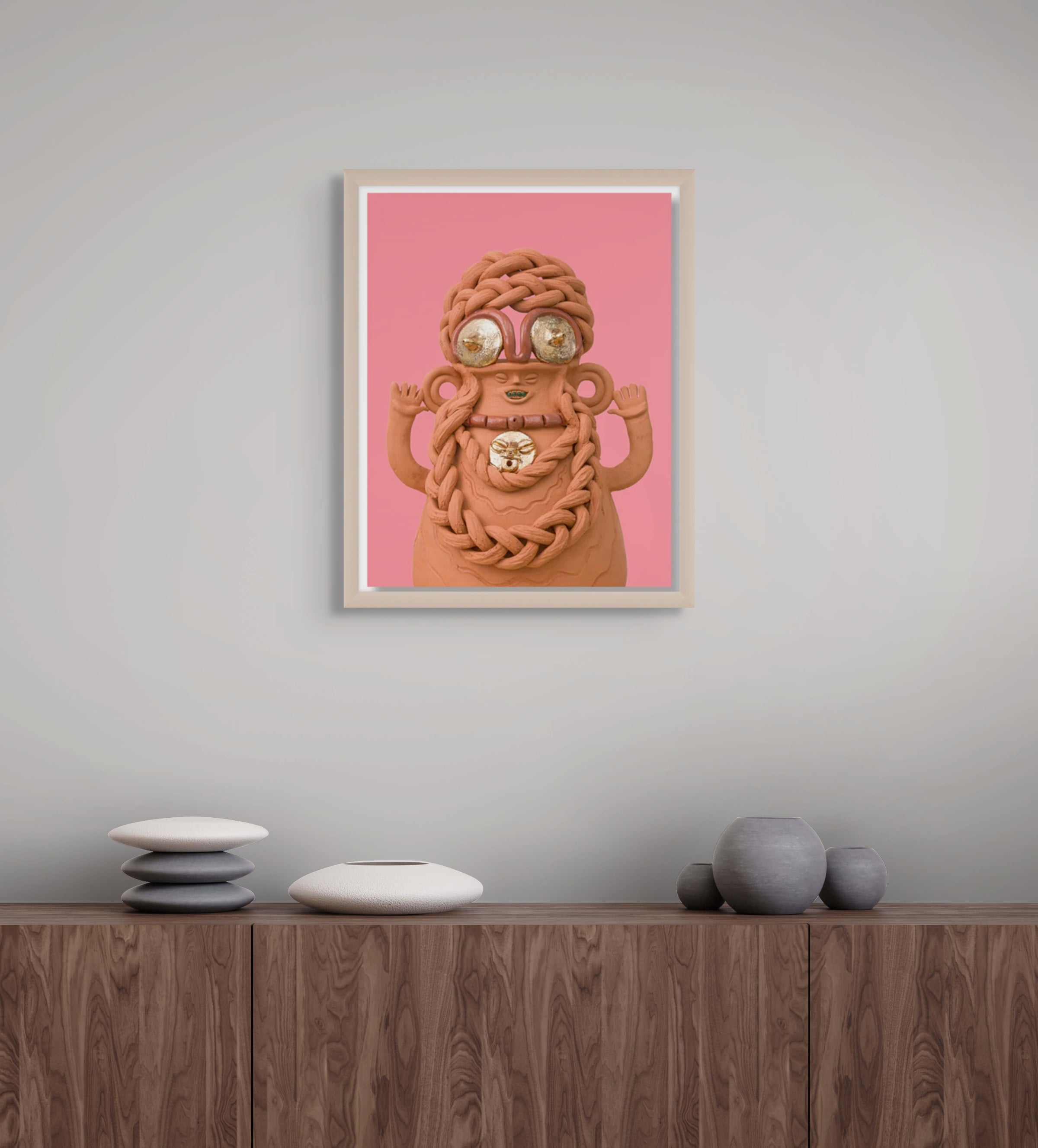 Nicoya, Pobre Diabla, and Besos de Sueño feature close-up views of vessels, each imbued with a distinct personality. For these works, Gaitan began by hand-building the terracotta forms, onto which gold elements were emblazoned to draw emphasis towards certain adornments and body parts. These sculptures were then photographed and superimposed onto vibrant backgrounds that not only evoke Nicaragua’s colorful architecture and tropical climate, but also lend a celebratory nature to the resulting images. In Nicoya, the figure is even duplicated, in a gesture that highlights the artist's playful approach. While Gaitan’s practice is rooted in Pre-Columbian aesthetic culture, it is also equally inspired by his own Pentecostal upbringing. He directs a devotional prayer to each work, in an expression of his personal longing to find a place in the world.