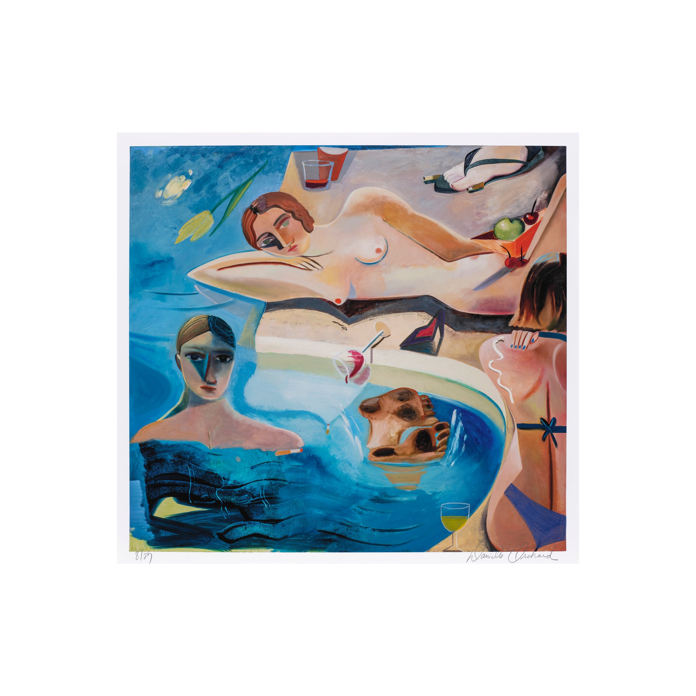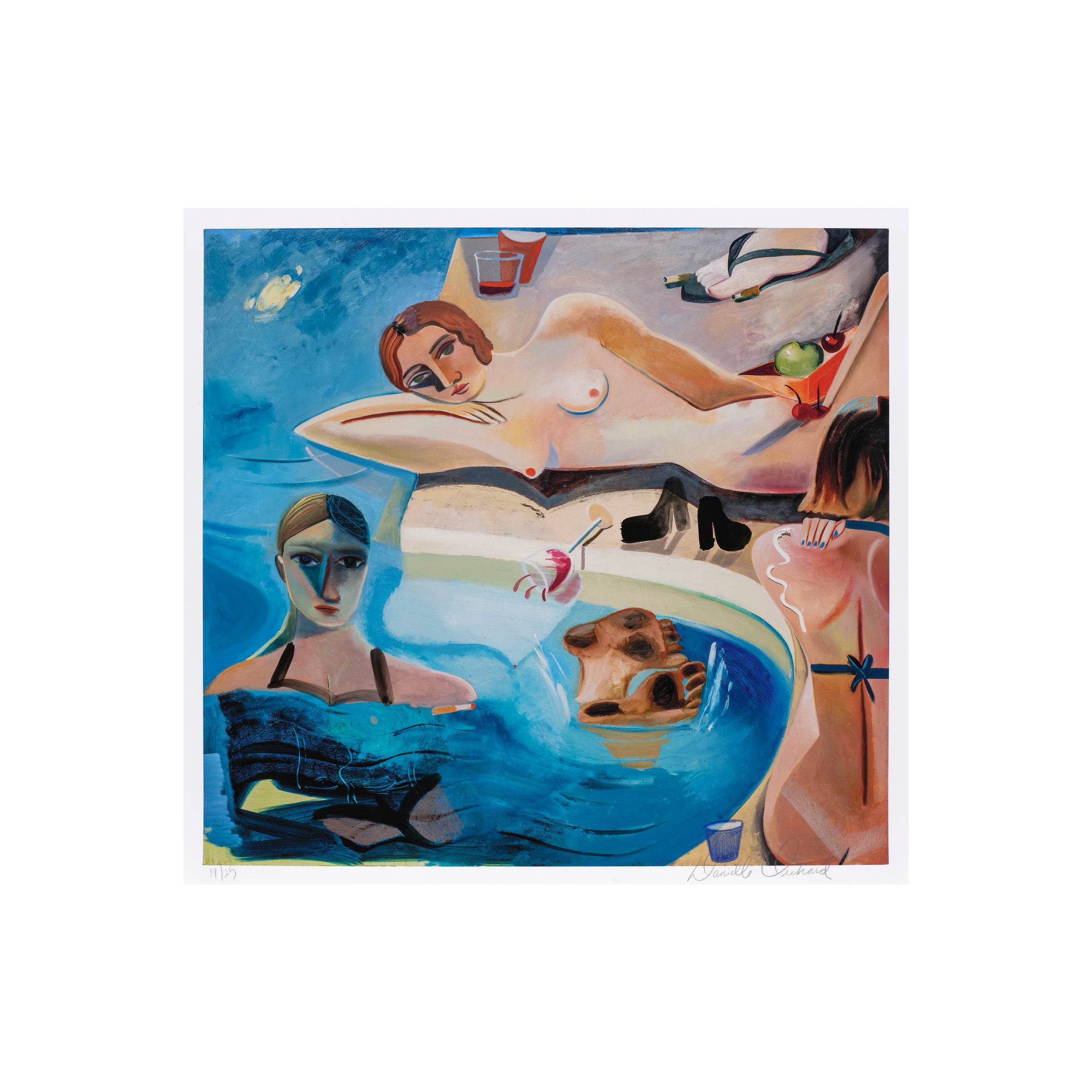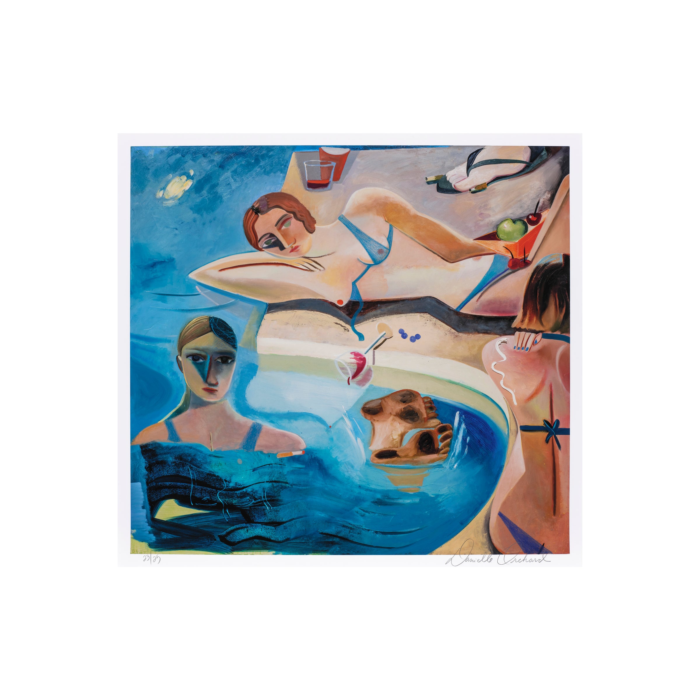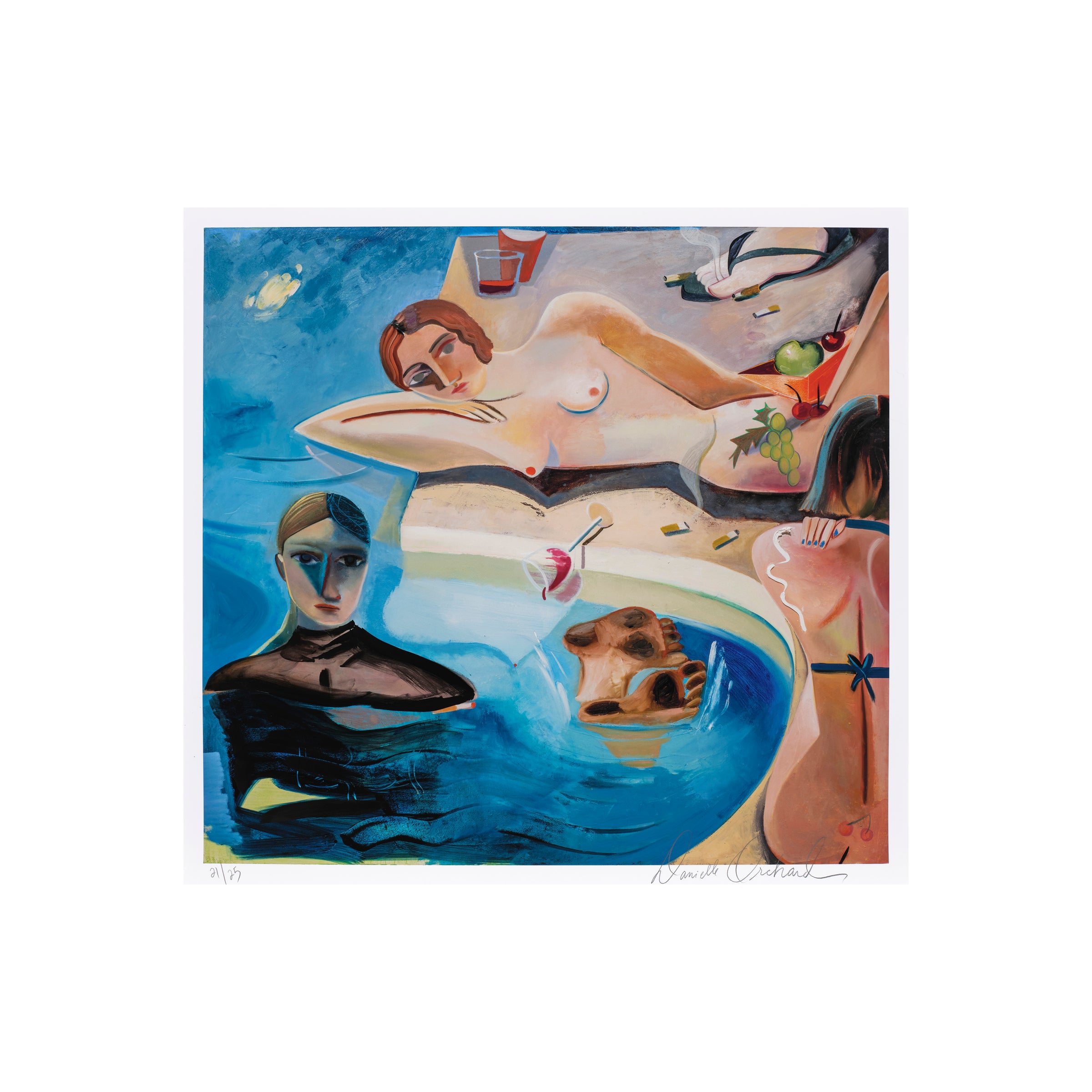 A portrait of various figures relaxing in and beside a pool, Swimmers continues the artist’s longstanding interest in the subject of the bather. Orchard infuses the work with a sense of visual unsteadiness—both through the dizzying space of the composition itself but also narratively, via spilled wine glasses and the ambiguous posture of a character who may or may not have just tumbled into the water. Intended to depict the narrow margin between events that are staged and others that happen by accident, the painting also demonstrates an experimental approach to form and scale. While one figure’s waist is perfectly aligned with the pool’s curvature, an otherwise unseen character’s foot, surrounded by smoked cigarettes, seems disproportionate to her companions’ sizes and positions. For this limited edition series, Orchard will render each print unique by adding hand-drawn objects such as fruit, wine glasses, and beer bottles, with a variety of mediums that include wax crayons, watercolor pencils, and pastel.Swimmers, 2025