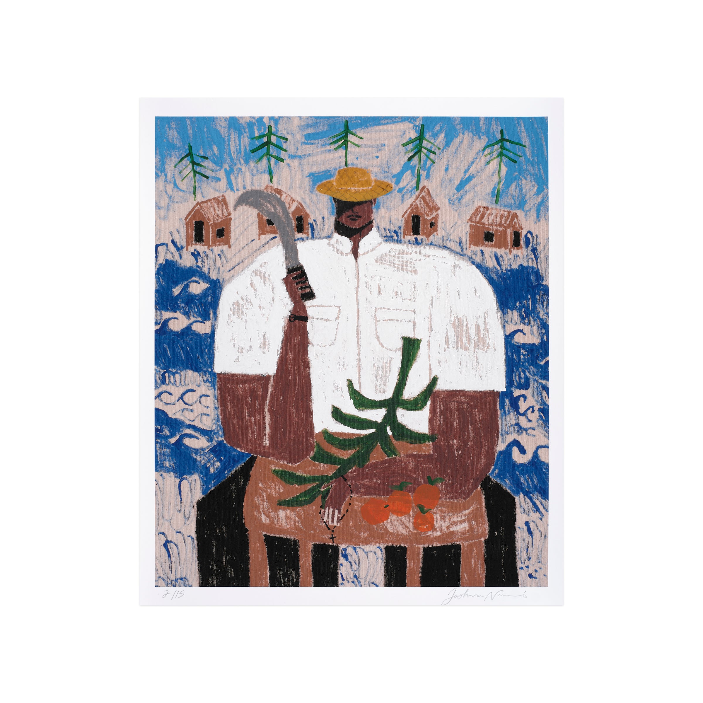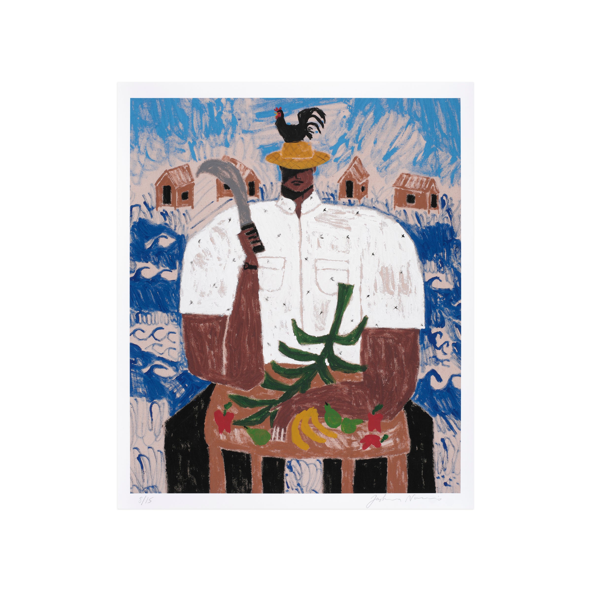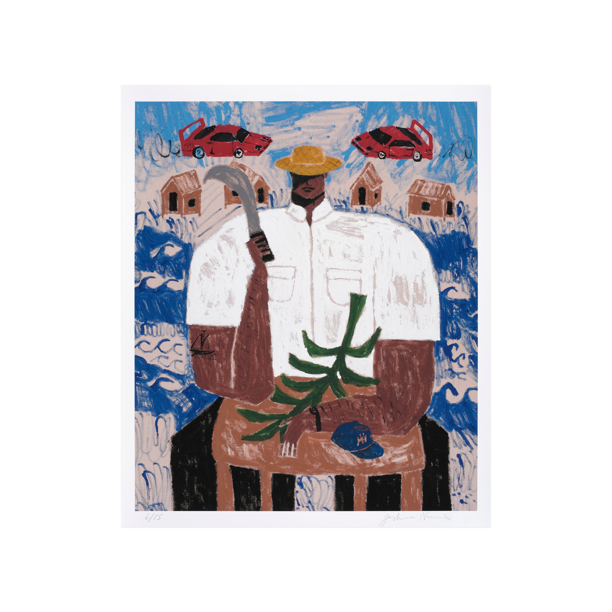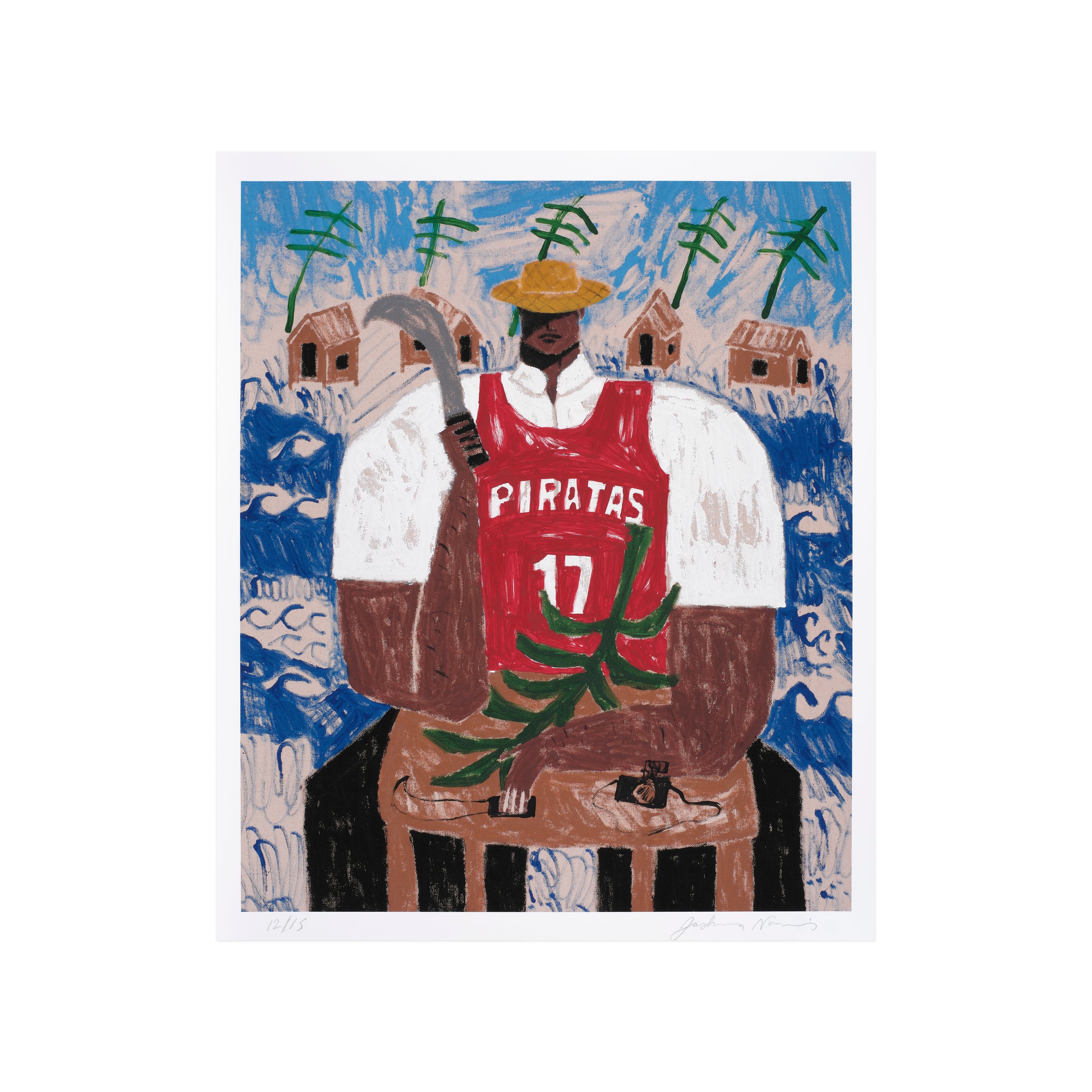 El Corta Plátanos (The Banana Cutter) depicts a man of the namesake profession, who is seated while wielding a curved blade. Although his face is partially obscured by the shade provided by his hat, the primary figure wields a powerful presence within the pictorial frame—commanding space and attention through his central position. The man’s crisp, white shirt also draws contrast from the backdrop, made up of a serene blue sky and a line of homes amid scores of undulating waves. As in many of Nazario Lugo’s works, the composition pays homage to Puerto Rican heritage by featuring those who are essential to daily life on the island, in spite of being often overlooked. The artist will additionally render each print with unique, hand-embellished elements such as palm trees, mountains, or tropical fruits; other prints may include subtle elements of sports and automobiles.