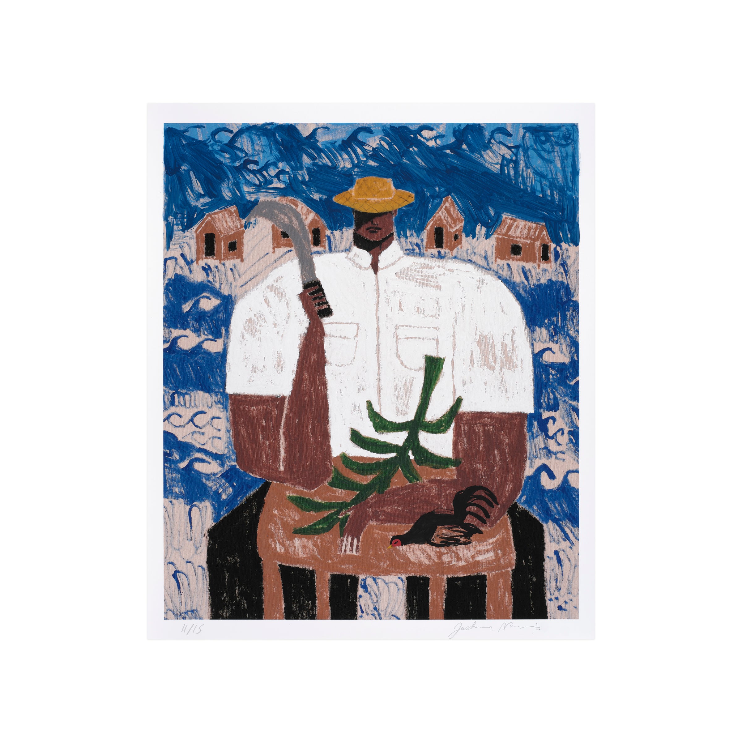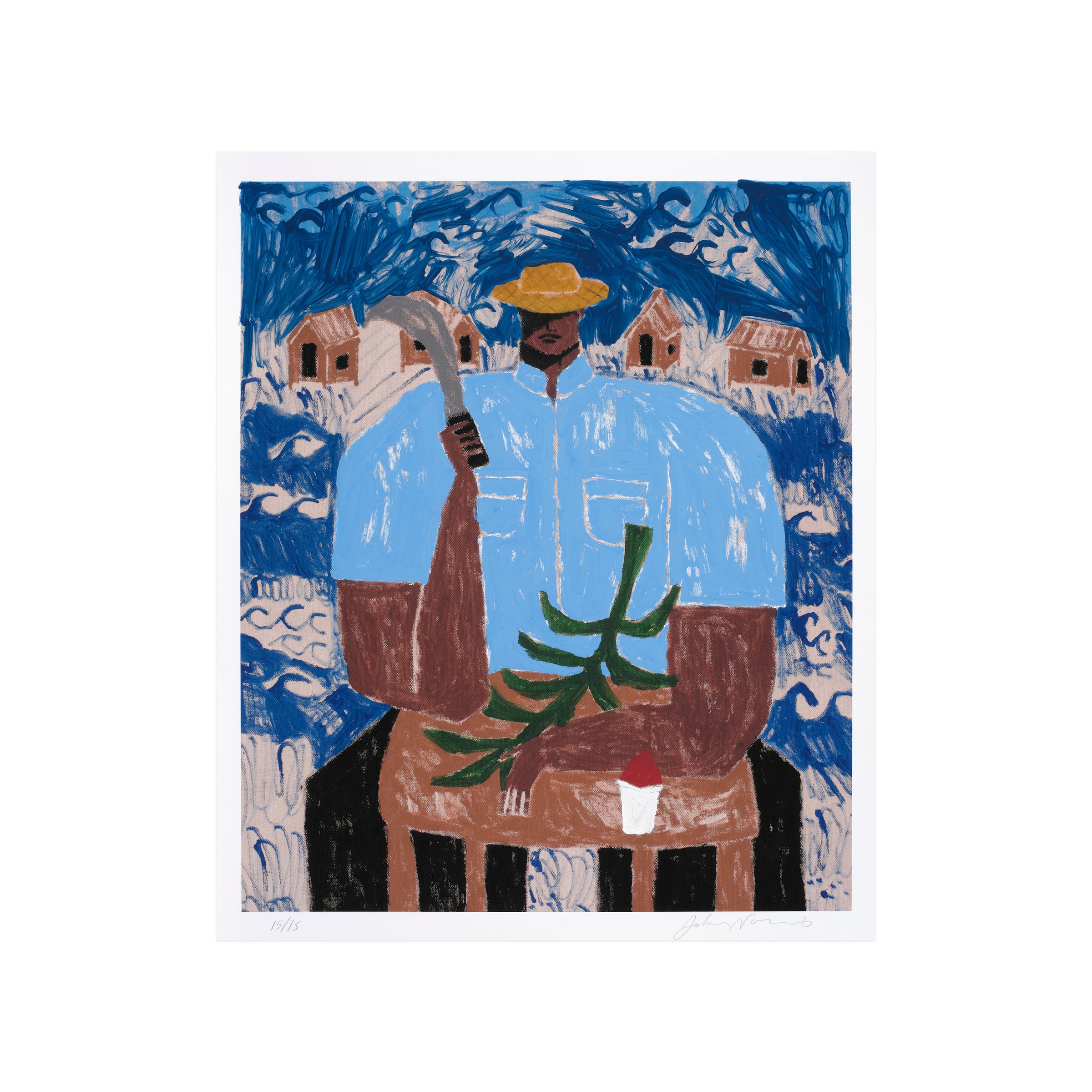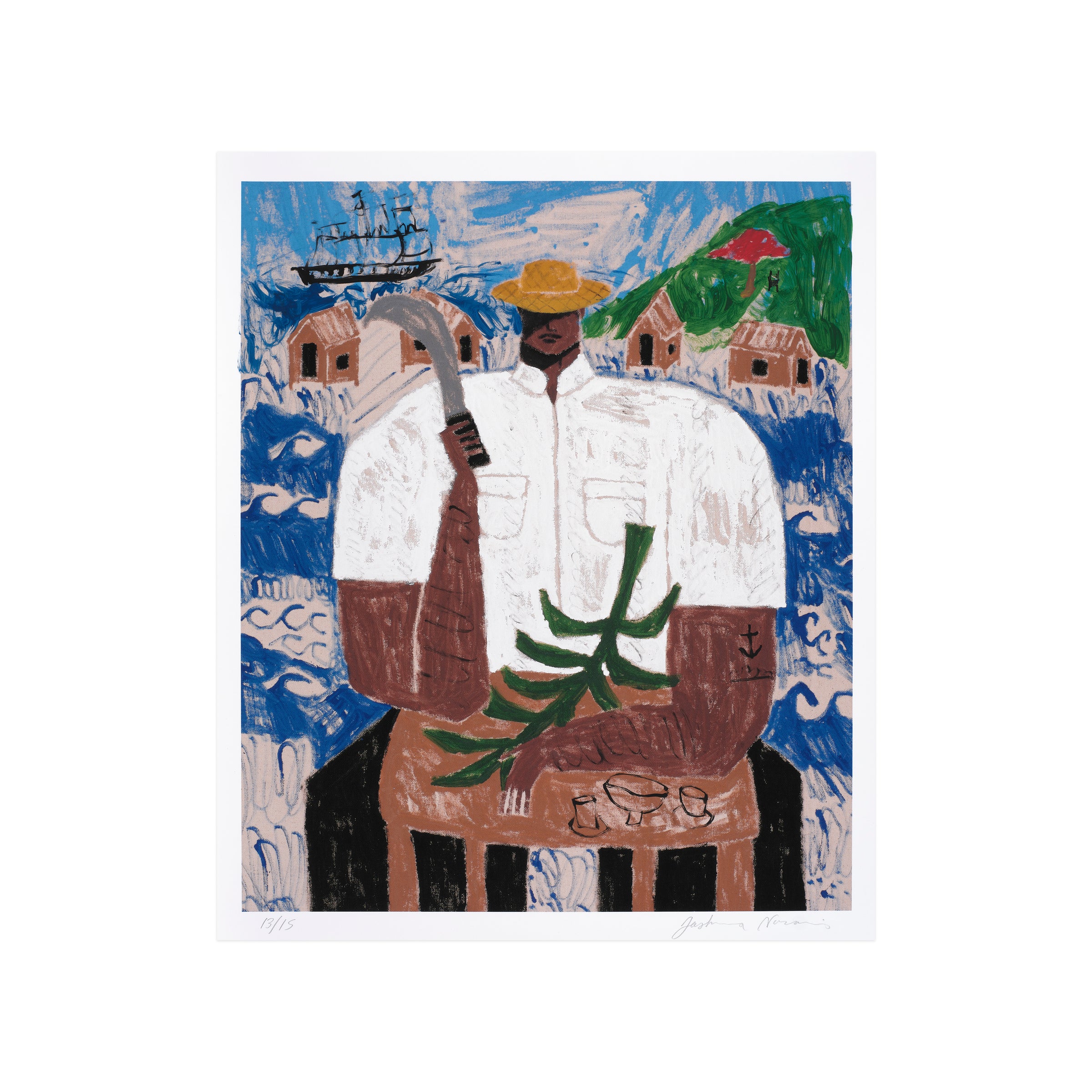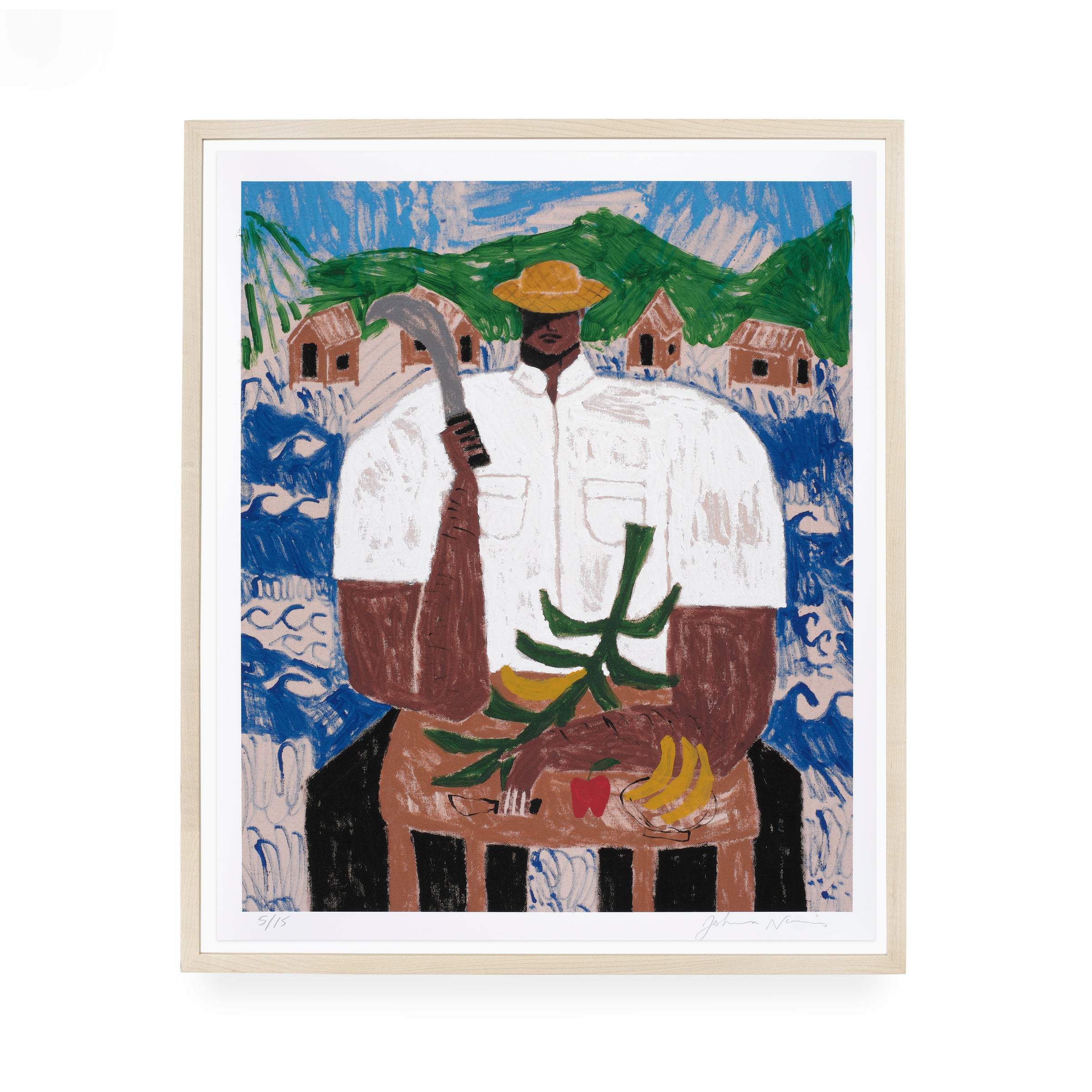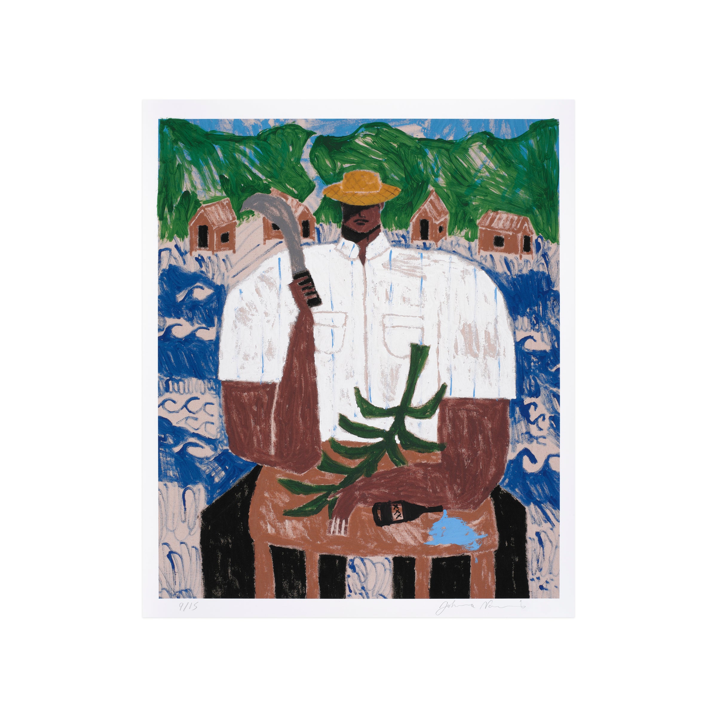 El Corta Plátanos (The Banana Cutter) depicts a man of the namesake profession, who is seated while wielding a curved blade. Although his face is partially obscured by the shade provided by his hat, the primary figure wields a powerful presence within the pictorial frame—commanding space and attention through his central position. The man’s crisp, white shirt also draws contrast from the backdrop, made up of a serene blue sky and a line of homes amid scores of undulating waves. As in many of Nazario Lugo’s works, the composition pays homage to Puerto Rican heritage by featuring those who are essential to daily life on the island, in spite of being often overlooked. The artist will additionally render each print with unique, hand-embellished elements such as palm trees, mountains, or tropical fruits; other prints may include subtle elements of sports and automobiles.
