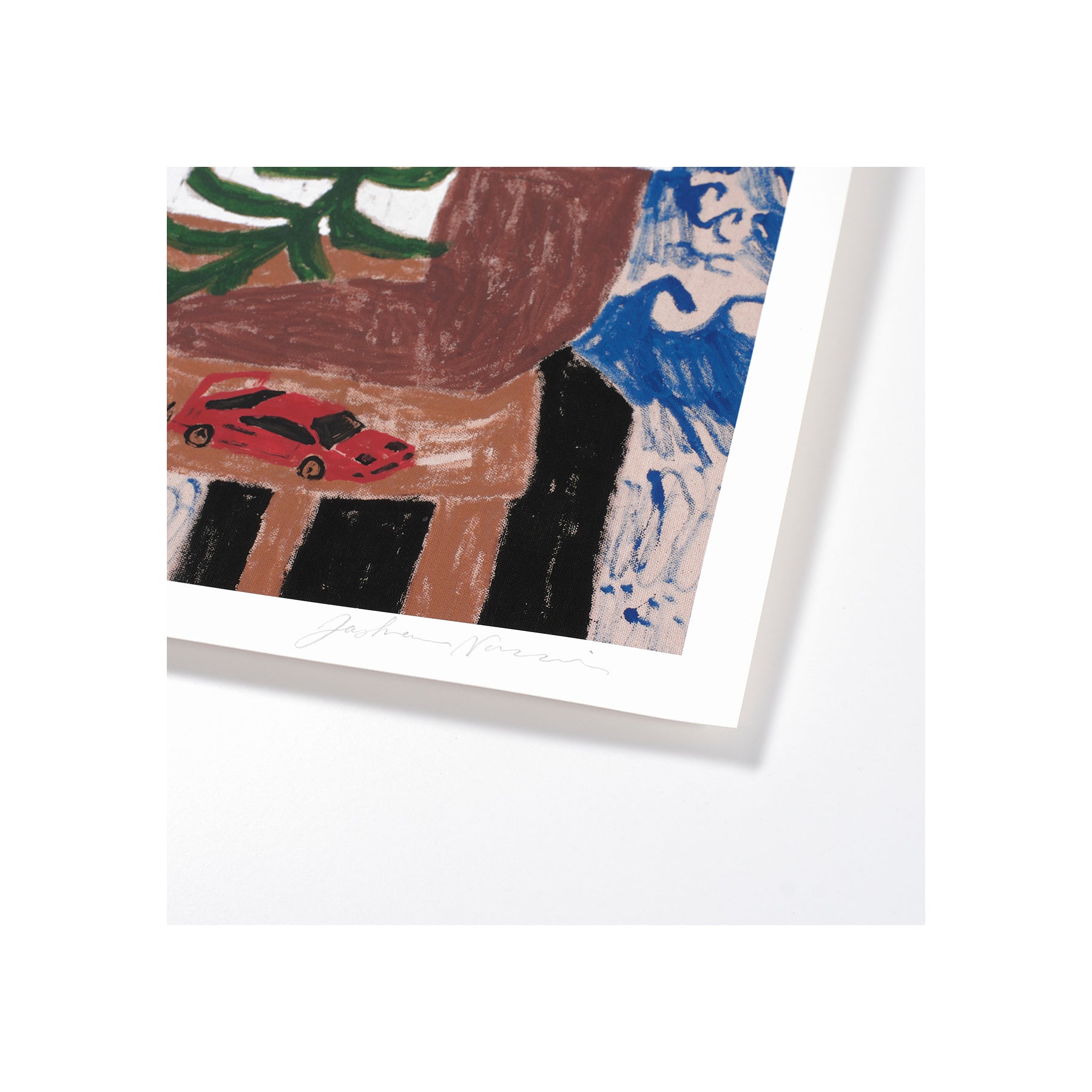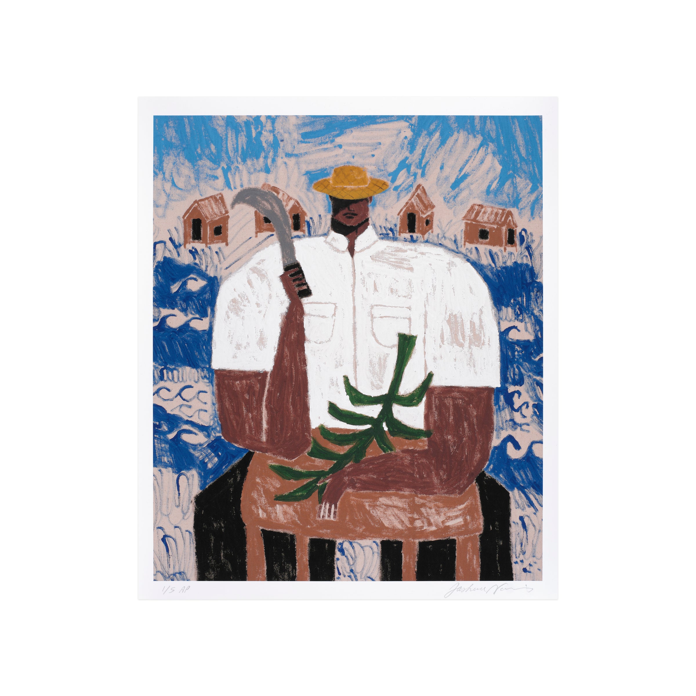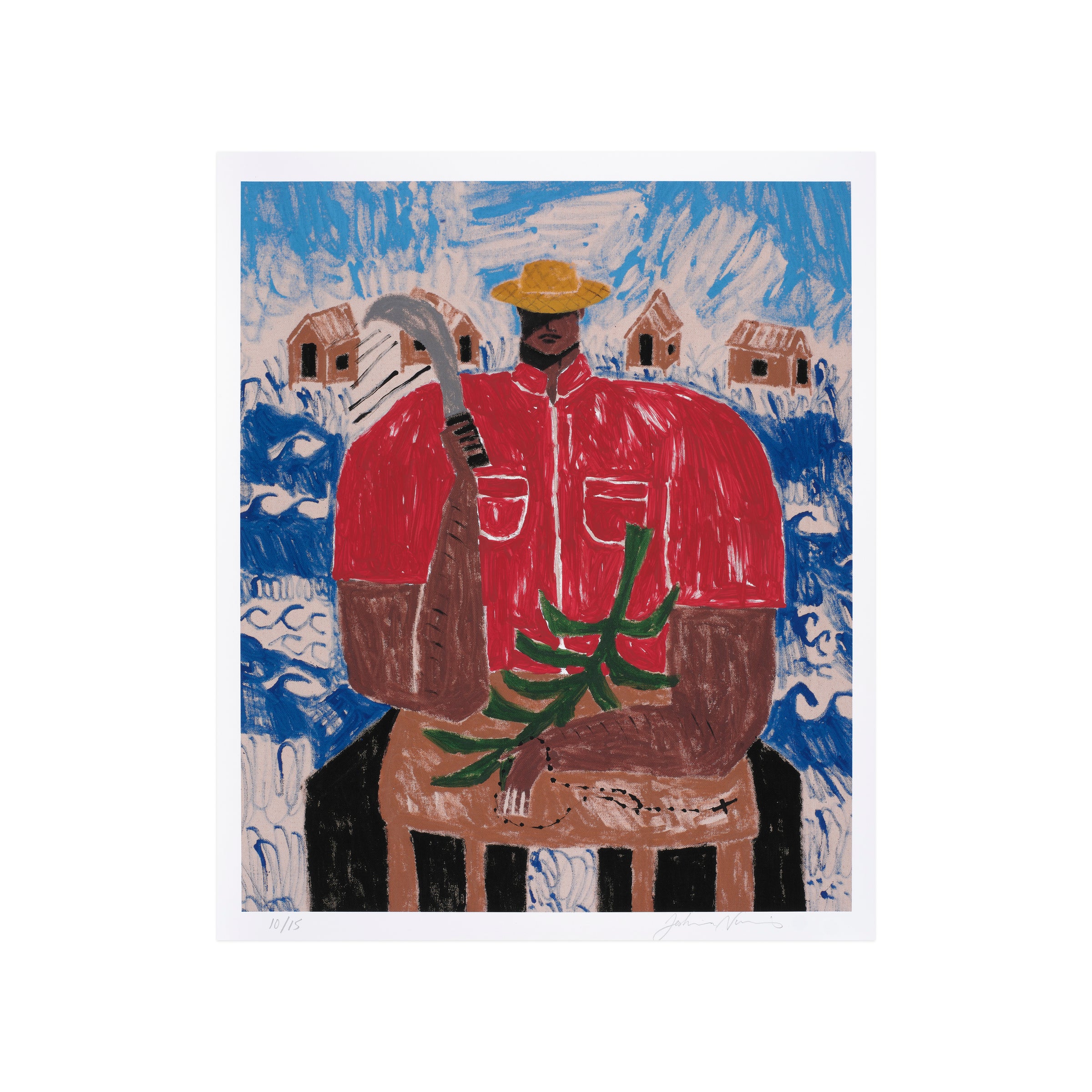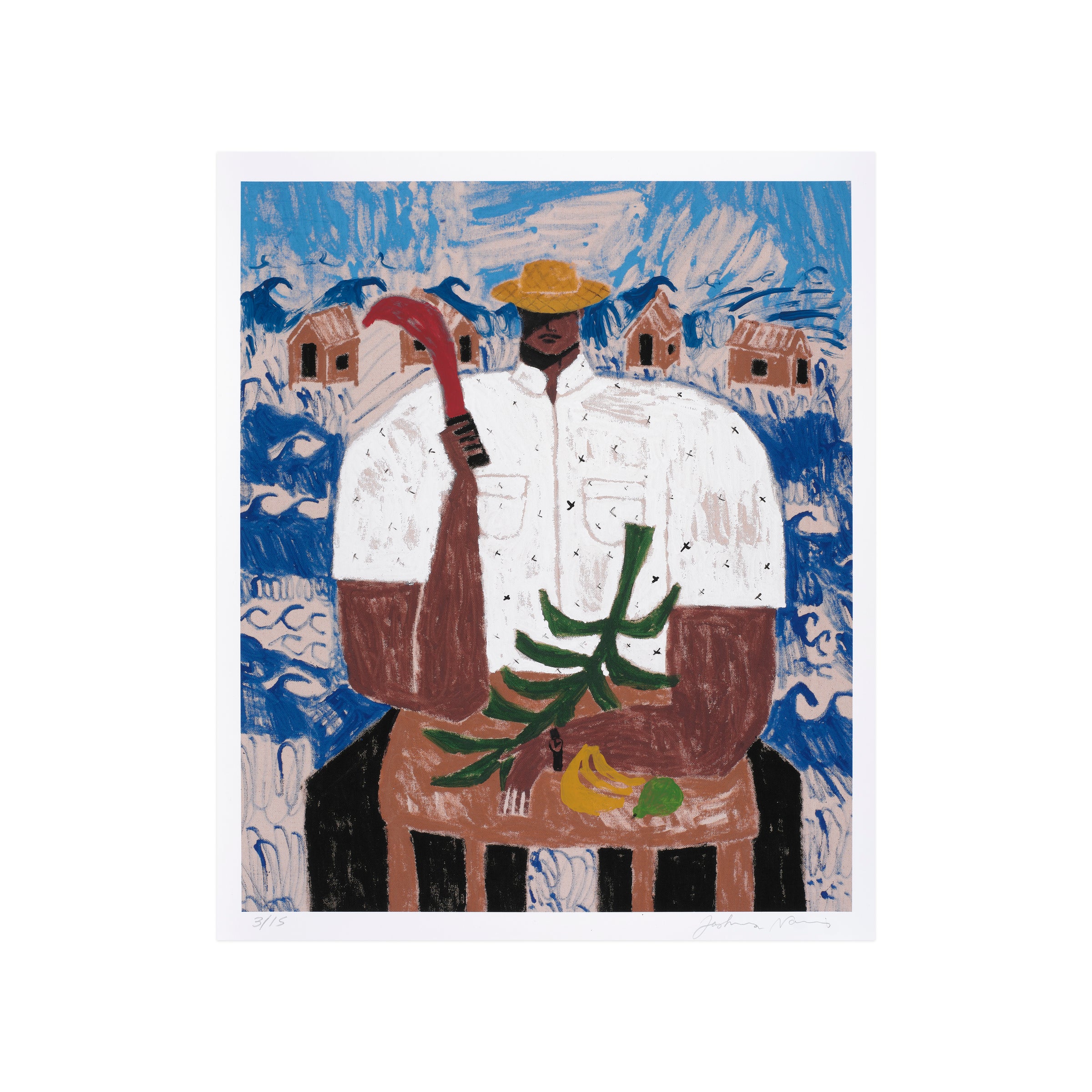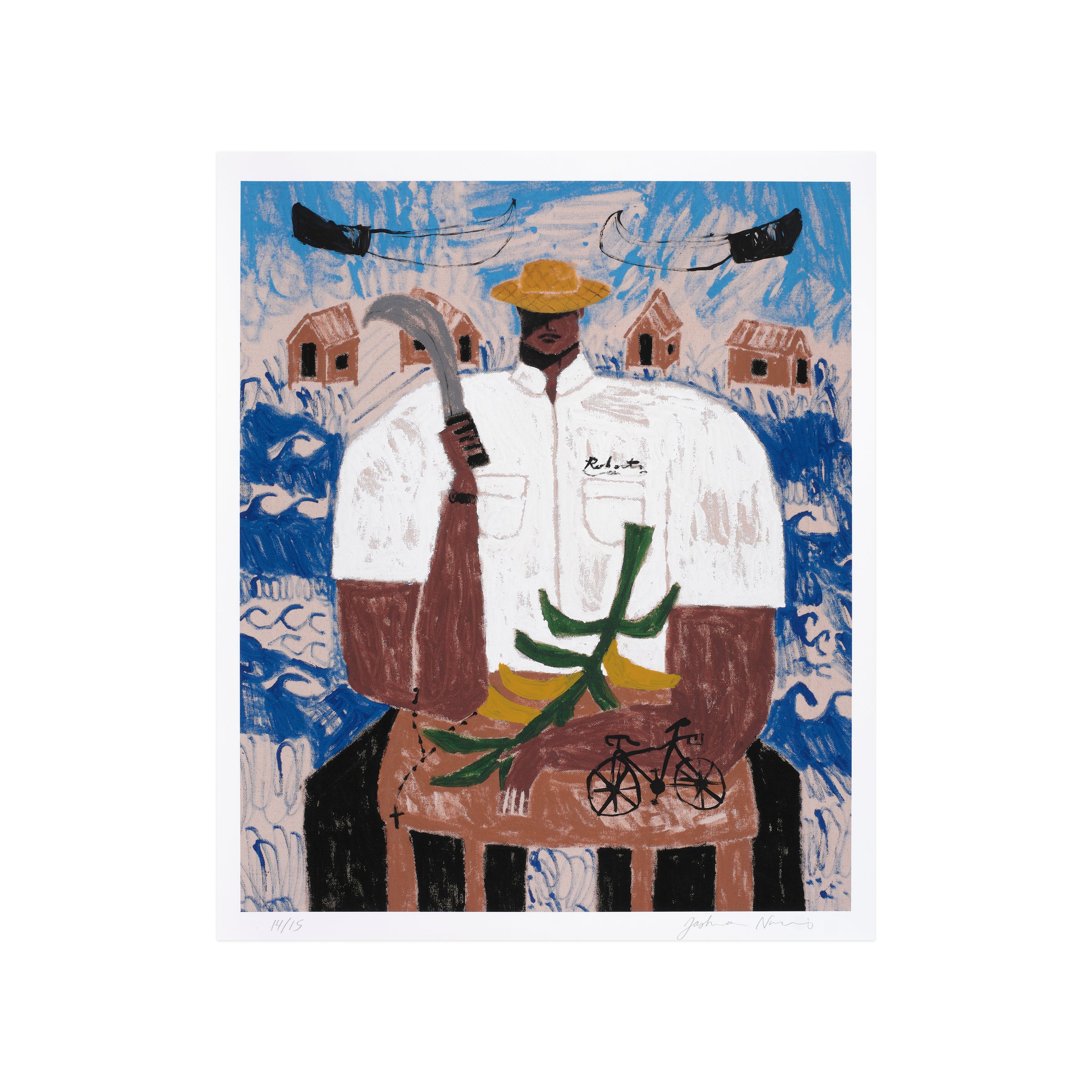 El Corta Plátanos (The Banana Cutter) depicts a man of the namesake profession, who is seated while wielding a machete. Although his face is partially obscured by the shade provided by his hat, the primary figure wields a powerful presence within the pictorial frame—commanding space and attention through his central position. The man’s crisp, white shirt also draws contrast from the backdrop, made up of a serene blue sky and a line of homes amid scores of undulating waves. As in many of Nazario’s works, the composition pays homage to Puerto Rican heritage by featuring those who are essential to daily life on the island, in spite of being often overlooked. The artist will additionally render each print with unique, hand-embellished elements such as palm trees, mountains, or tropical fruits; other prints may include subtle elements of sports and automobiles.