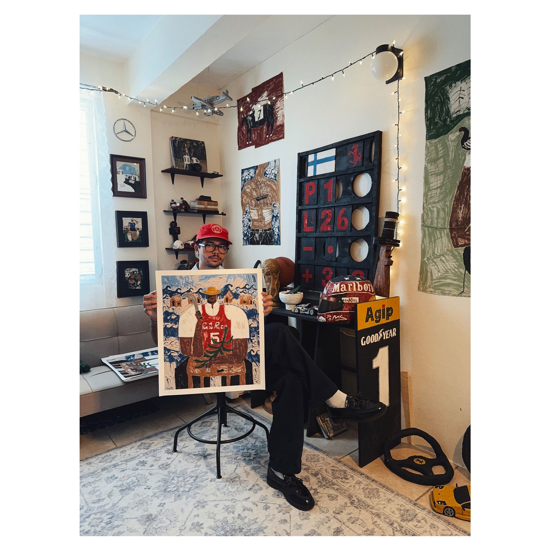 Joshua Nazario is a self-taught artist born and based in Puerto Rico. His practice celebrates the Caribbean island’s identity, through paintings that highlight its people and culture while tapping into personal memories. Using simple materials like concrete and wood, the artist transforms depictions of various symbols and objects—for instance, workers, athletes, and cars—into reflections on resilience, pride, and the value found in daily life. Nazario has presented work at galleries across Puerto Rico as well as the United States, including EMBAJADA, San Juan; PROXYCO Gallery, New York; Dinner Gallery, New York; and Charlie James Gallery, Los Angeles. He is currently the ART FOR CHANGE artist-in-residence in Santa Monica, CA.