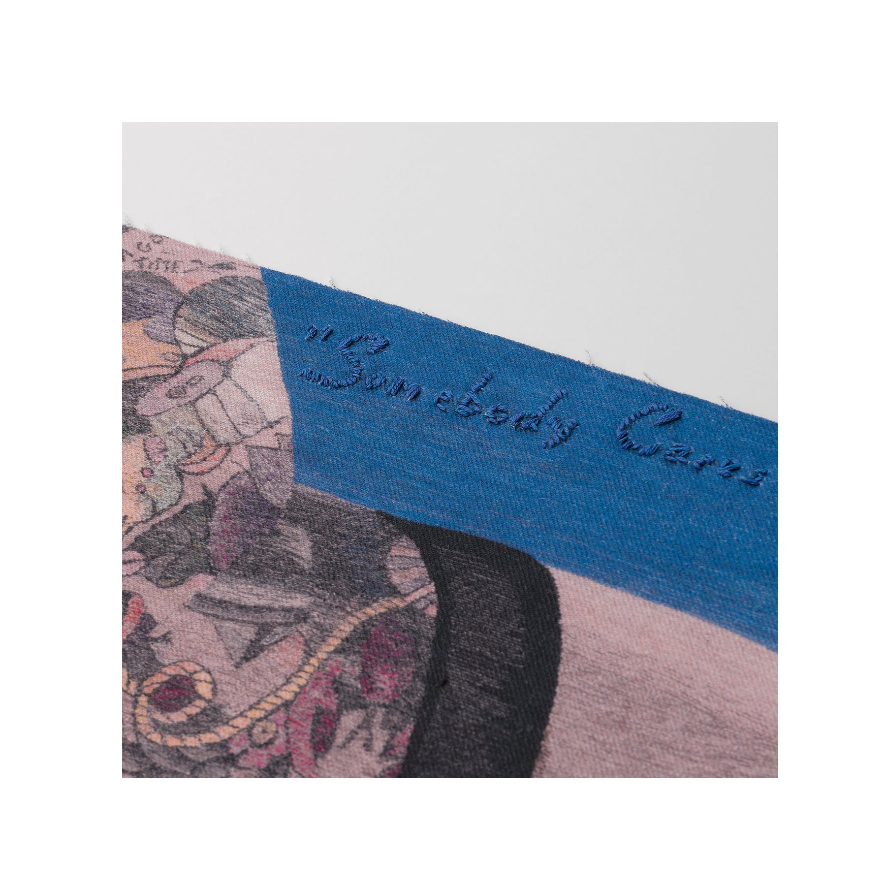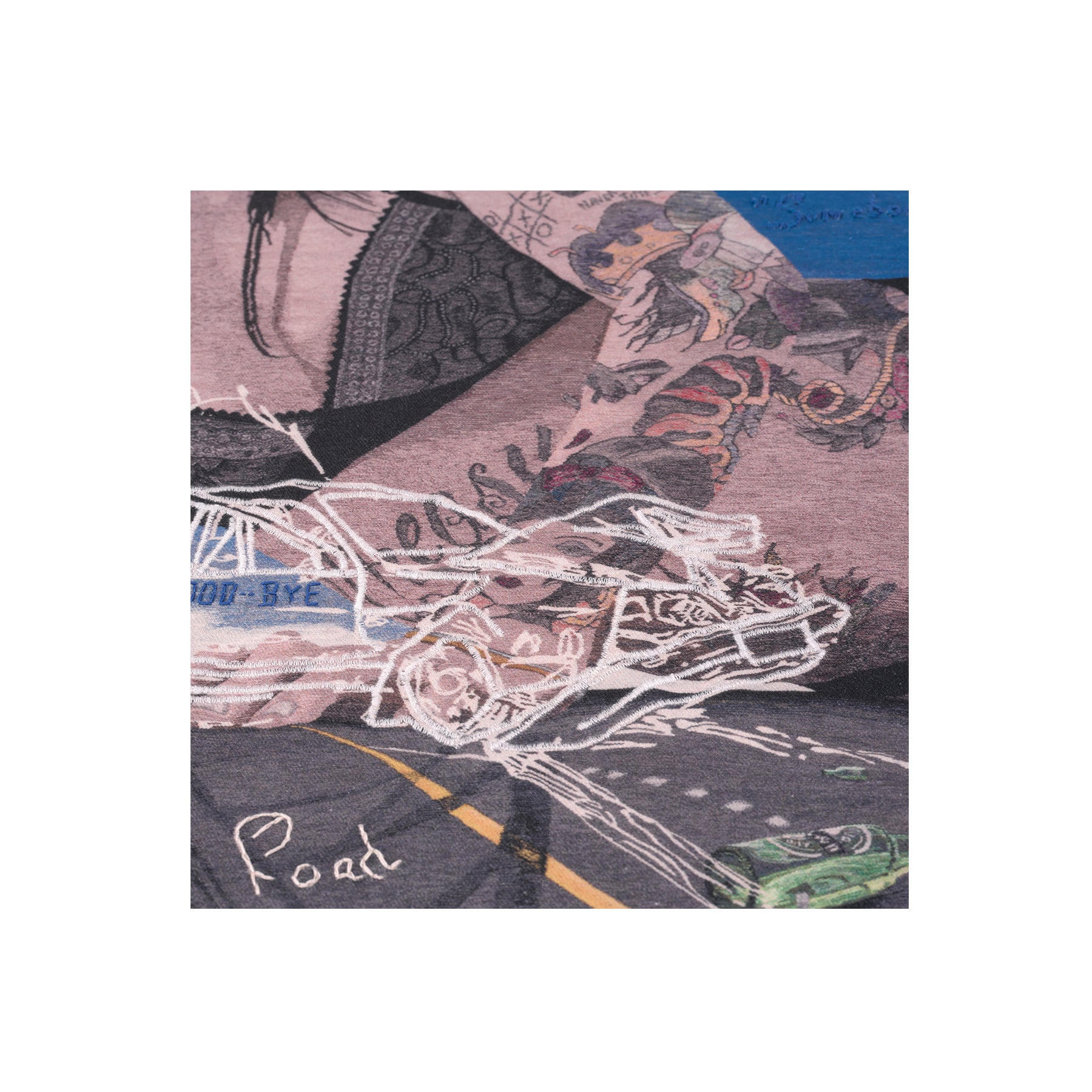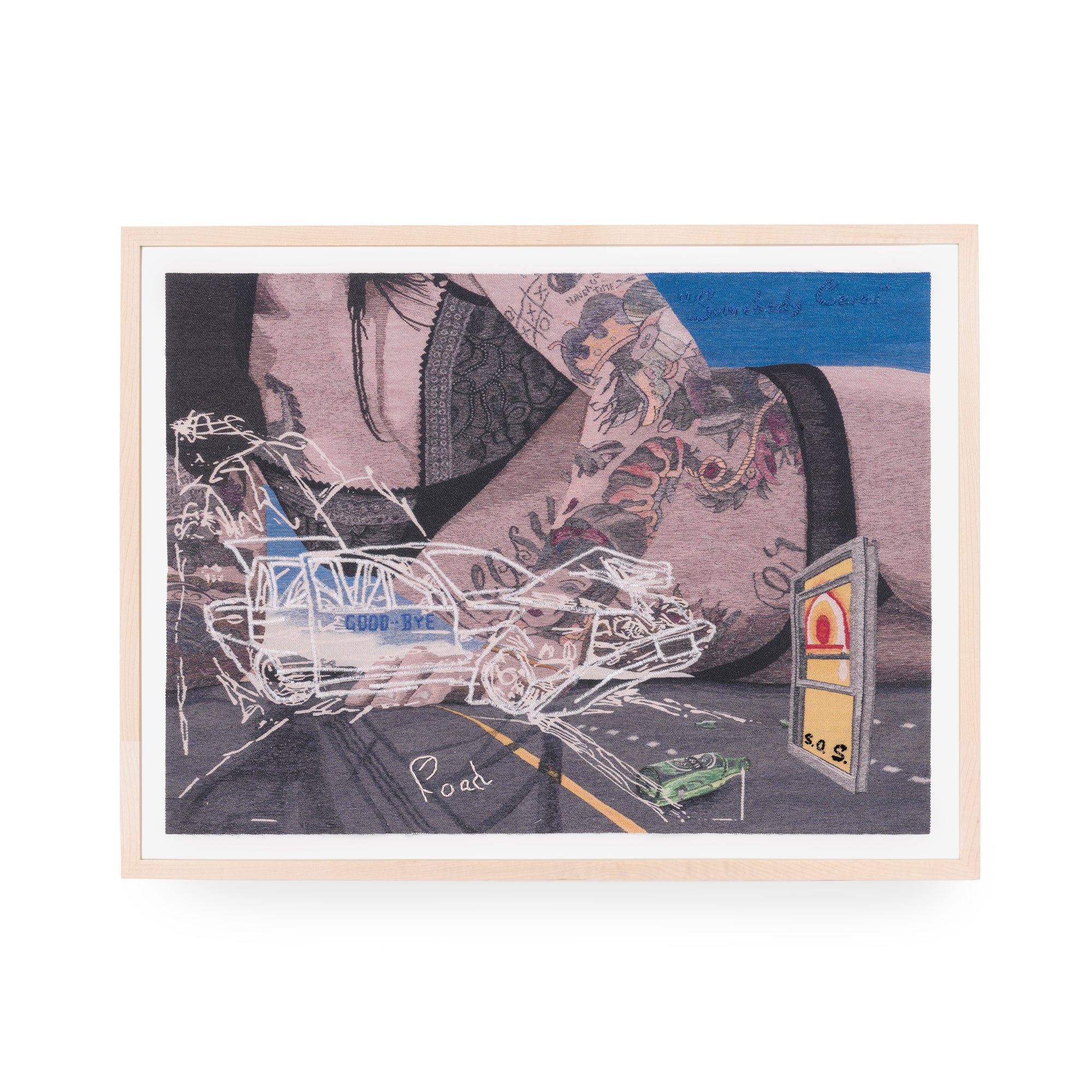 Somebody Cares portrays the artist’s tattooed torso, reclining in larger-than-life scale atop an asphalt highway. Various objects—a smashed beer bottle, a window pane that spells out the SOS distress signal, and a crashed vehicle—also appear, alluding to a sense of impending disaster. Regarding her artistic practice, Riley notes, “My work is about generational trauma, the search for self identity both online and within relationships, and how our experiences affect the way we move through the world. I aim to use autobiographical elements with broader language and imagery to translate universal experiences.” Printed on white denim, each edition in this limited series features unique elements that include hand-embroidered text, and a machine-sewn overlay on the white contours of the depicted car.