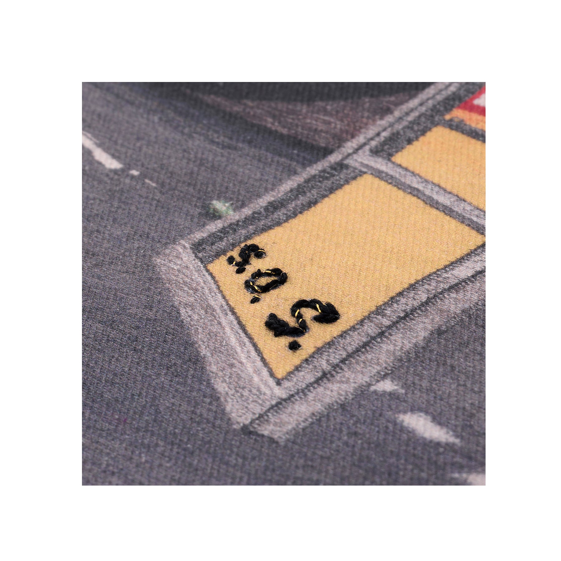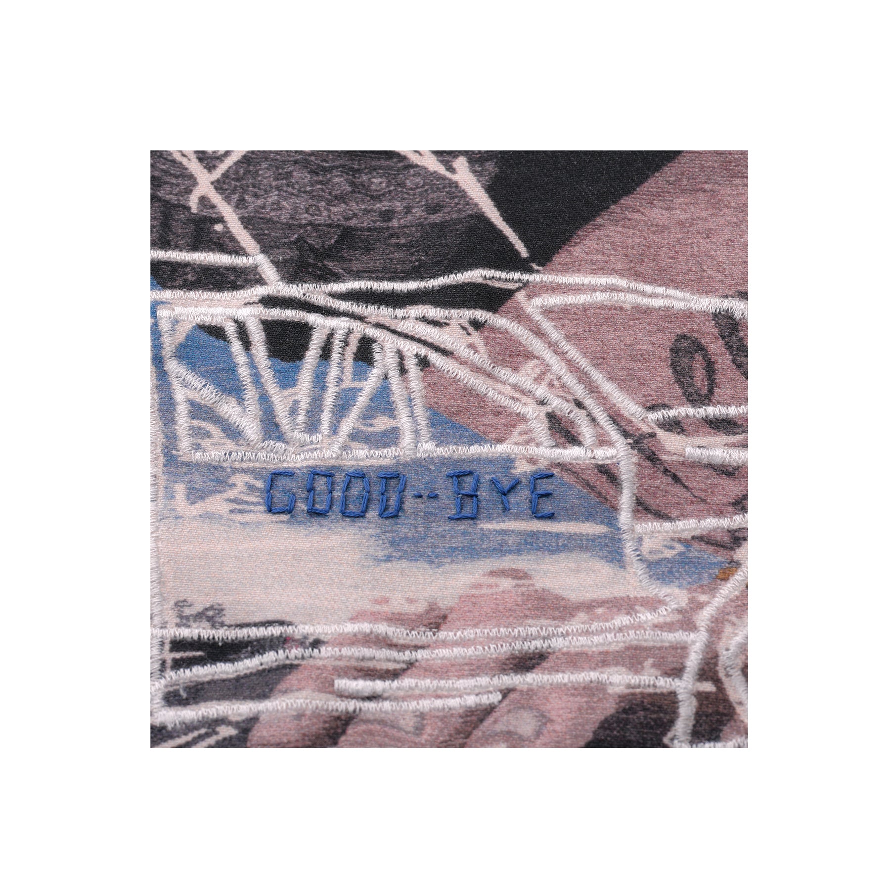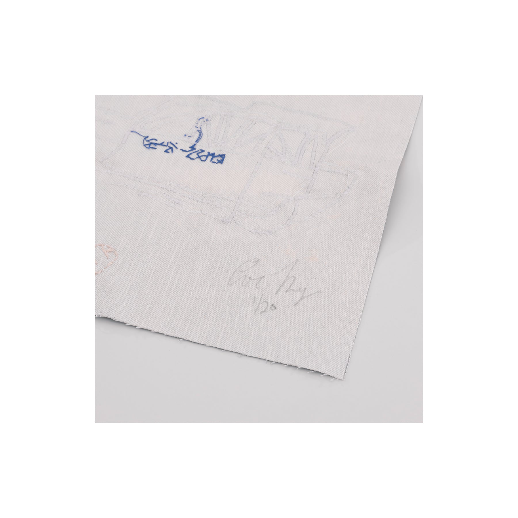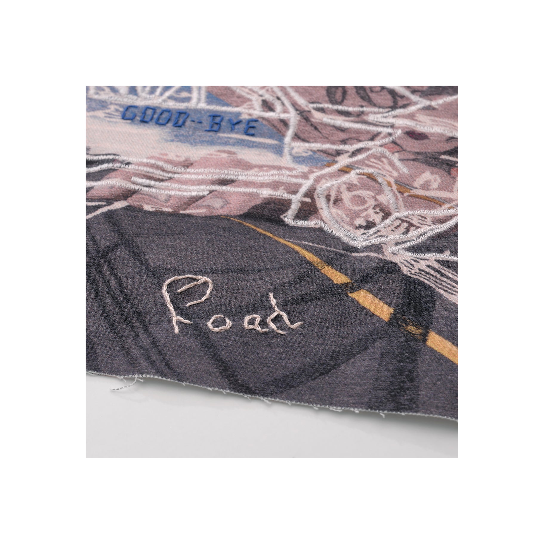 Somebody Cares portrays the artist’s tattooed torso, reclining in larger-than-life scale atop an asphalt highway. Various objects—a smashed beer bottle, a window pane that spells out the SOS distress signal, and a crashed vehicle—also appear, alluding to a sense of impending disaster. Regarding her artistic practice, Riley notes, “My work is about generational trauma, the search for self identity both online and within relationships, and how our experiences affect the way we move through the world. I aim to use autobiographical elements with broader language and imagery to translate universal experiences.” Printed on white denim, each edition in this limited series features unique elements that include hand-embroidered text, and a machine-sewn overlay on the white contours of the depicted car.
