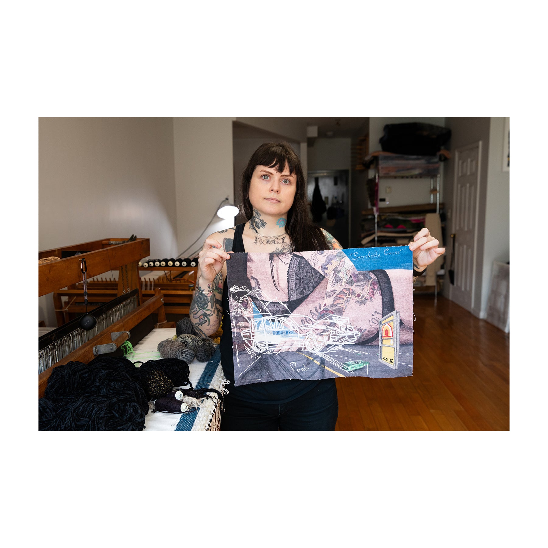 Erin M. Riley crafts meticulous, large-scale tapestries depicting intimate, erotic, and psychologically raw imagery. Using a floor loom, traditional techniques, and hand-dyed wool yarn, the Brooklyn-based artist combine collaged elements—drawn from personal photographs, images sourced from the internet, newspaper clippings, and other ephemera—as a way of reflecting upon relationships, memories, fantasies, and trauma. Riley’s work has been exhibited around the world, and has been acquired into the public collections of the Brooklyn Museum in New York, NY, and the Frances Young Tang Teaching Museum of Art at Skidmore College in Saratoga Springs, NY, among others. In 2021, she also received a United States Artists Fellowship Grant, as well as an American Academy of Arts & Letters Art Purchase Prize.