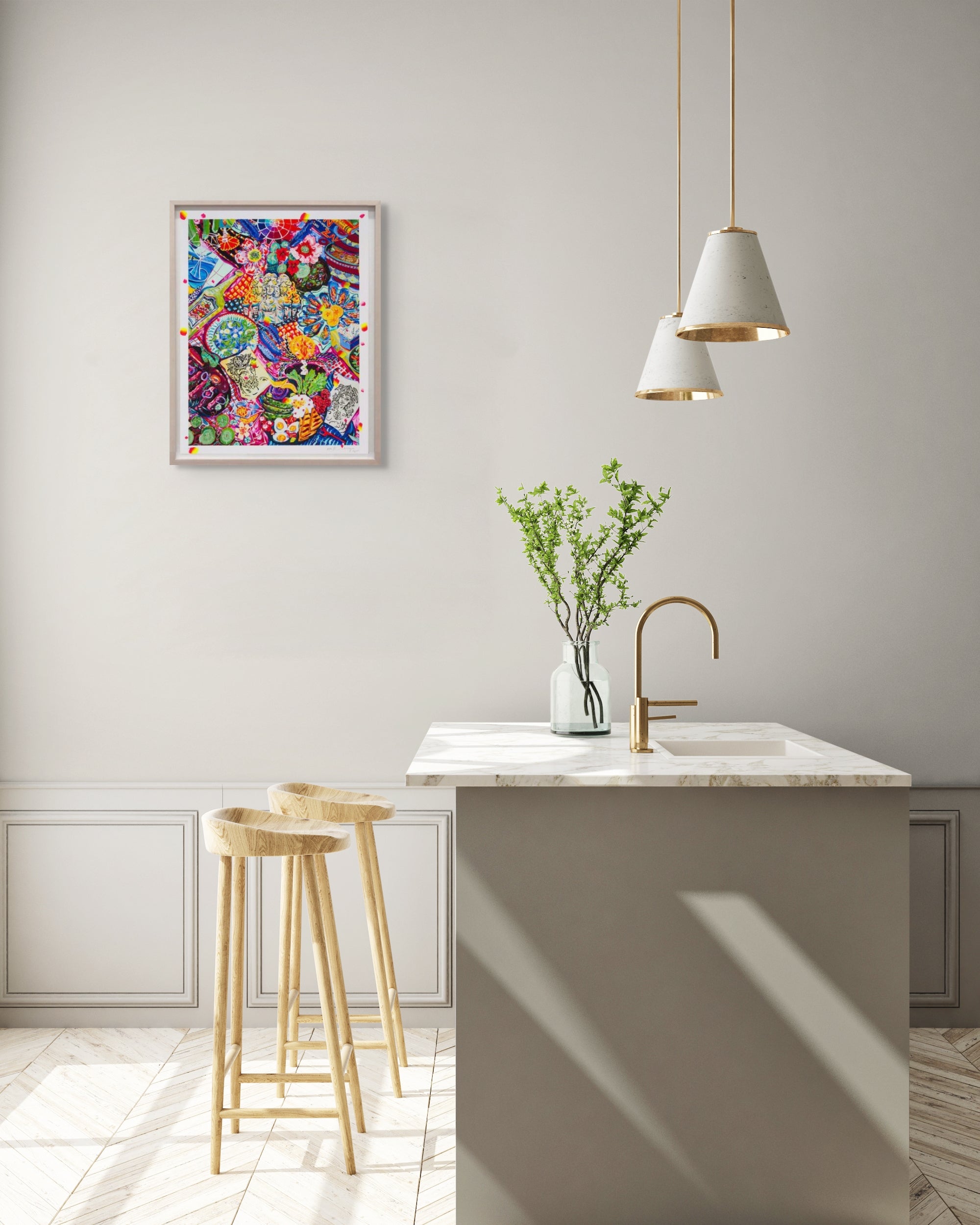 Hecate and the Muses is loaded with personal and mythical touchstones, yet is still a slice of the breadth of influences Kate Pincus-Whitney draws from in her work. Diagnosed dyslexic and stereoblind (unable to perceive three-dimensional depth) as a child, Pincus-Whitney conjures meaning and dialogue through the arrangement of objects and characters that enliven her neon tablescapes. Depth is created through the complex layering and collage of the visual elements that bunch and pull the checkered tablecloths underlying each of the objects. A trio of eccentric busts wielding fiery torches, Hecate and her muses are, highlighted with the artist’s characteristic painterly verve in the same vibrant blues, greens and pinks scattered throughout the composition. Two portraits of the artist and her partner, represented in comparably Grecian aesthetics, are tucked between the crowded plates and bottles swirling about the composition. Classical symbols like her partner’s crown of apples and the poppies that fall across her chest and in her hair, speak to themes of creation, memory, muses and myth in the formation of our collective unconscious. The artist has hand-embellished the edition with painted details in the borders and throughout the scene, making each print unique.