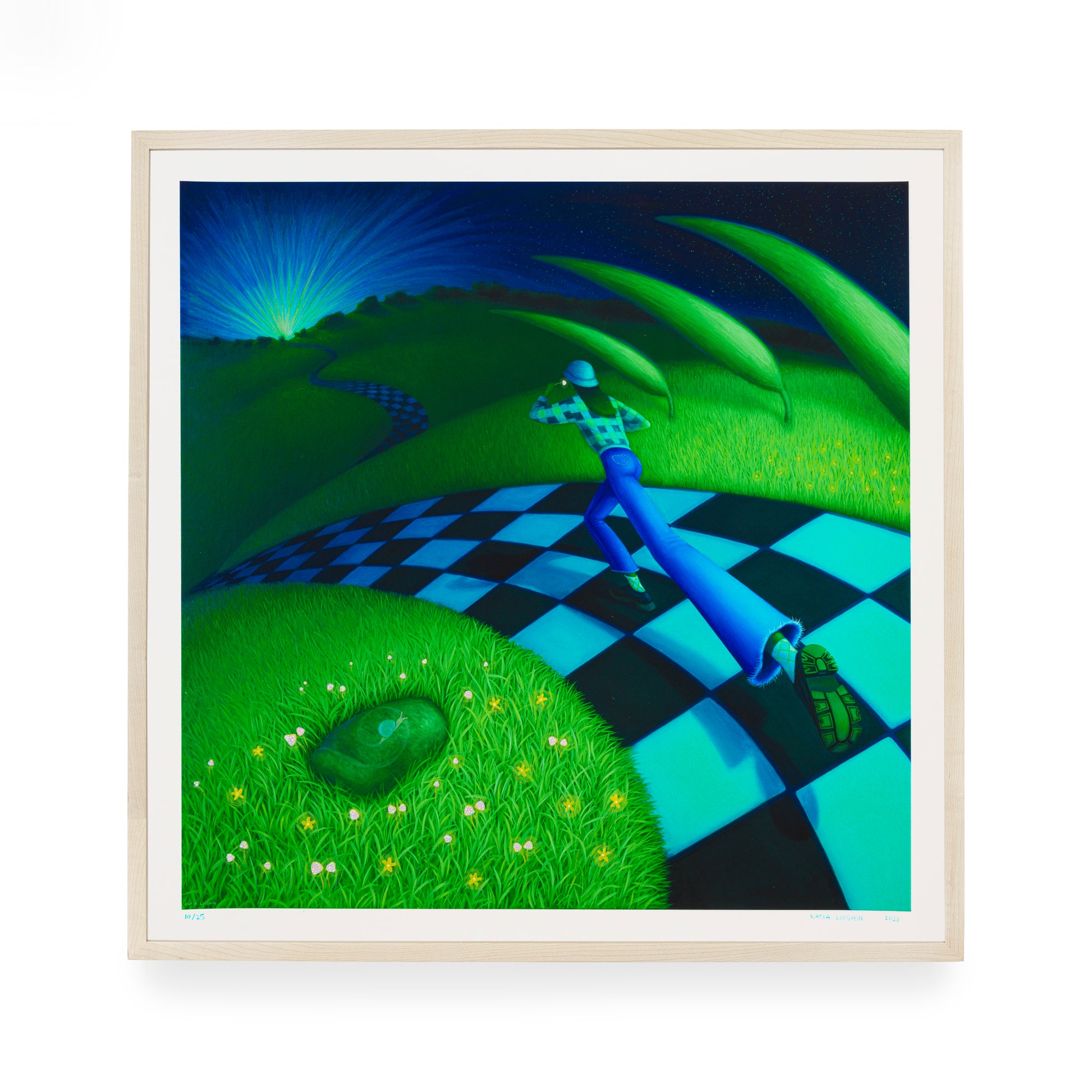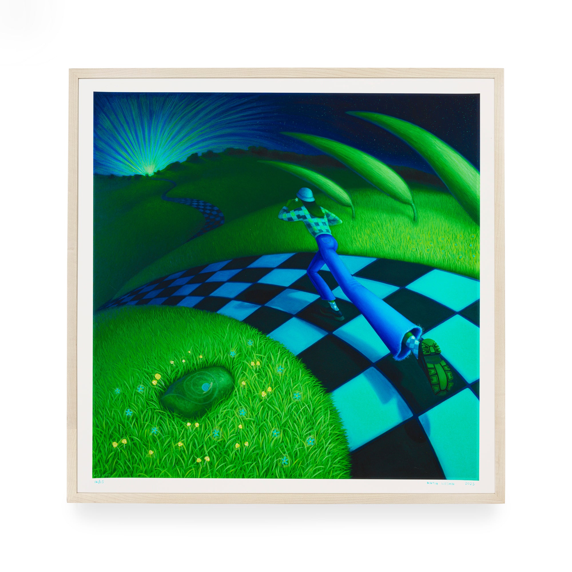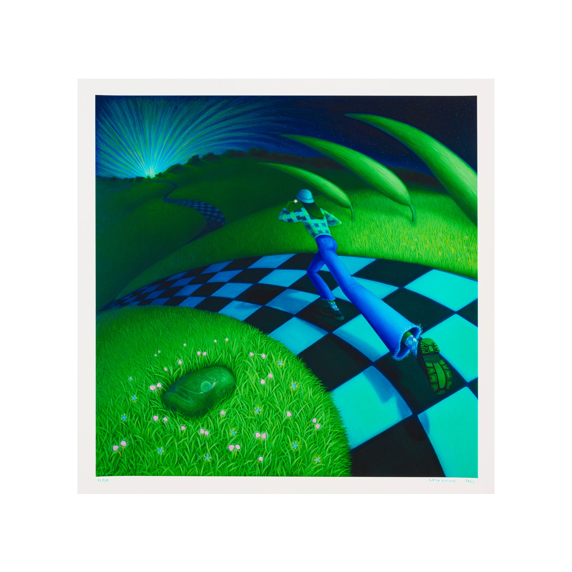 Impetus is a new edition from Katia Lifshin in her signature spacebending, surrealist, green and blue style. Her recurring protagonist steps into the seemingly endless checkered path, swirling through the hills toward a light in the distance. Concerned with identity, femininity and self-conception, Lifshin’s character floats through the neon haze space with a conviction that opposes the foreboding journey down the psychedelic trail. The artist has hand-embellished the edition with additional details on the clothes and in sky and added snails and mushrooms throughout the environment with colored pencil and acrylic paint, making each print a unique work.