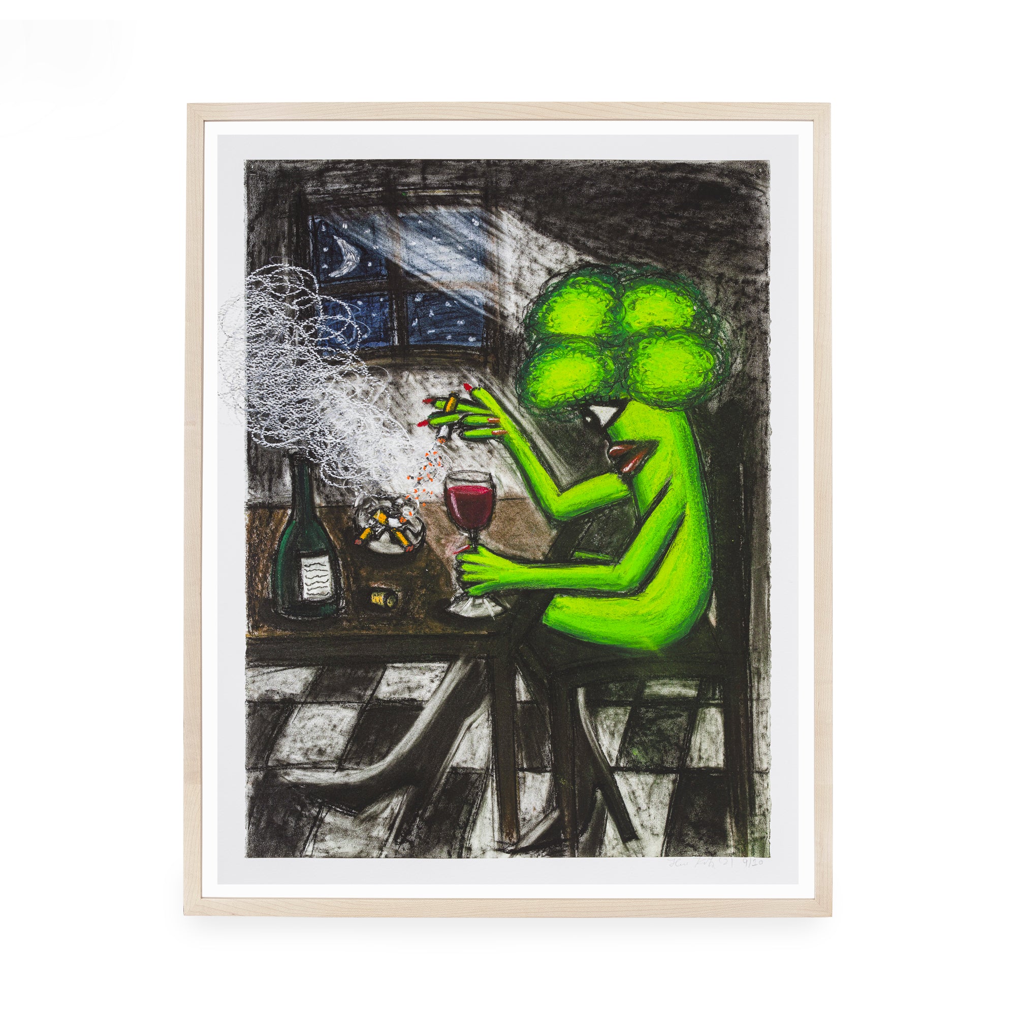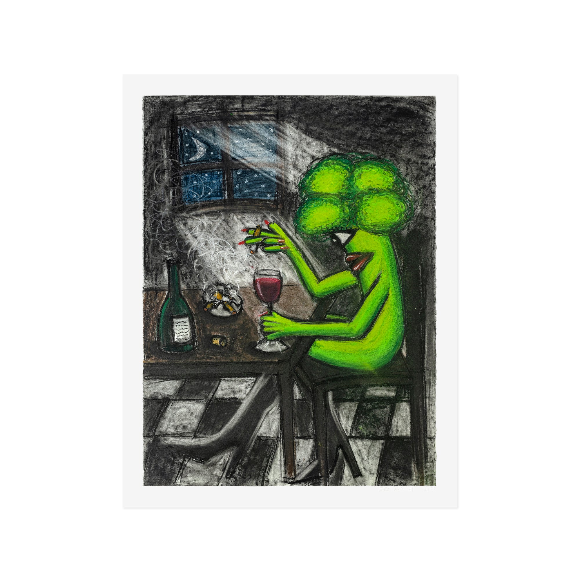 Drinking and Smoking Alone centers on a human-like broccoli that is seated at a table in the dark of night. Clutching a lit cigarette with one hand and a glass of wine with the other, the bright green broccoli pops against a largely black and white backdrop, rendered with crude strokes that contribute towards an overarching feeling of angst and rebellion. Although Koh does not smoke and rarely drinks alone, the actions express the sentiment of loneliness and alienation that many experienced during the pandemic. The act of smoking within her practice represents a moment of reflection, taking time for one's self and processing. The artist has hand embellished ten of the prints by accentuating the smoke and cigarettes with oil pastel.