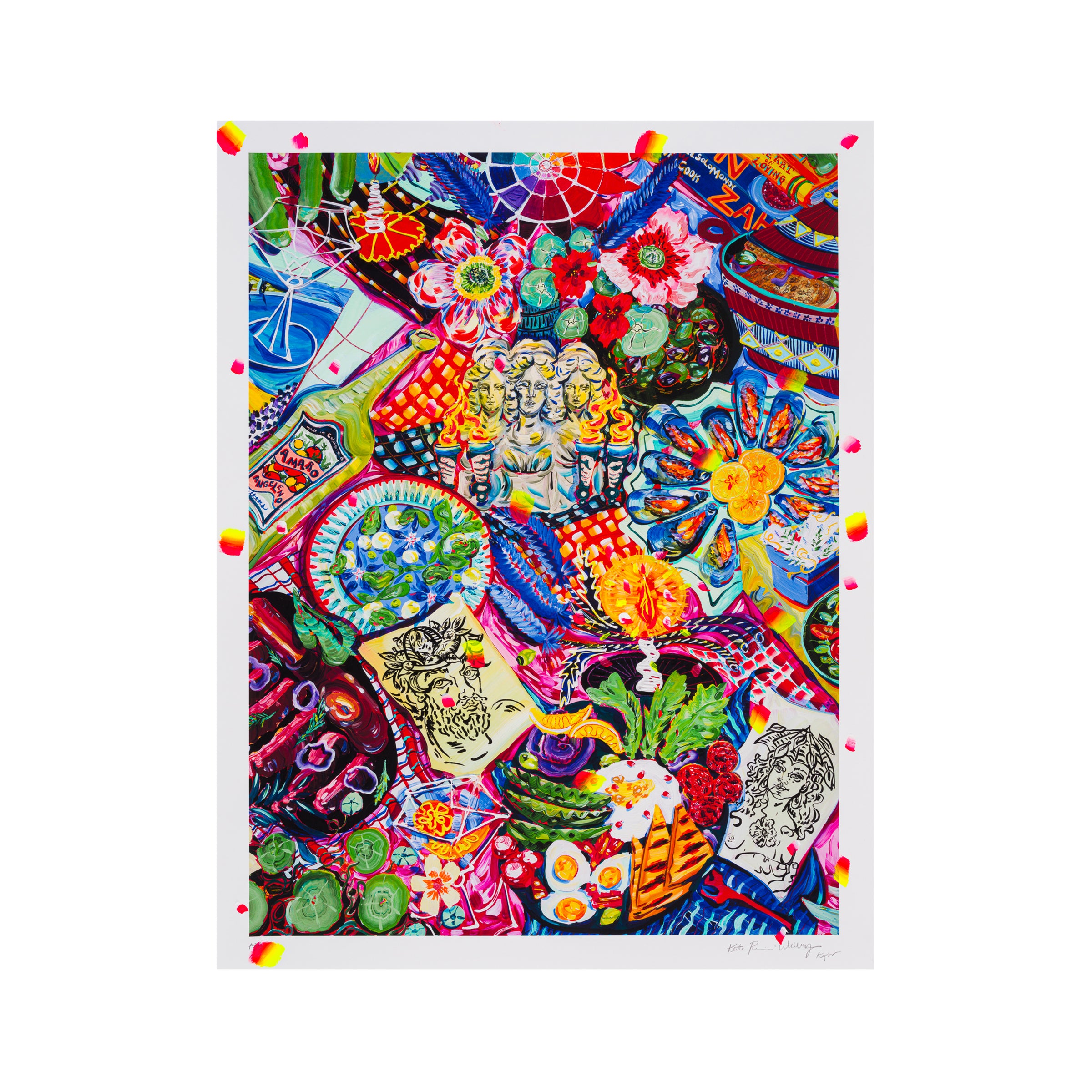 Hecate and the Muses is loaded with personal and mythical touchstones, yet is still a slice of the breadth of influences Kate Pincus-Whitney draws from in her work. Diagnosed dyslexic and stereoblind (unable to perceive three-dimensional depth) as a child, Pincus-Whitney conjures meaning and dialogue through the arrangement of objects and characters that enliven her neon tablescapes. Depth is created through the complex layering and collage of the visual elements that bunch and pull the checkered tablecloths underlying each of the objects. A trio of eccentric busts wielding fiery torches, Hecate and her muses are, highlighted with the artist’s characteristic painterly verve in the same vibrant blues, greens and pinks scattered throughout the composition. Two portraits of the artist and her partner, represented in comparably Grecian aesthetics, are tucked between the crowded plates and bottles swirling about the composition. Classical symbols like her partner’s crown of apples and the poppies that fall across her chest and in her hair, speak to themes of creation, memory, muses and myth in the formation of our collective unconscious. The artist has hand-embellished the edition with painted details in the borders and throughout the scene, making each print unique.