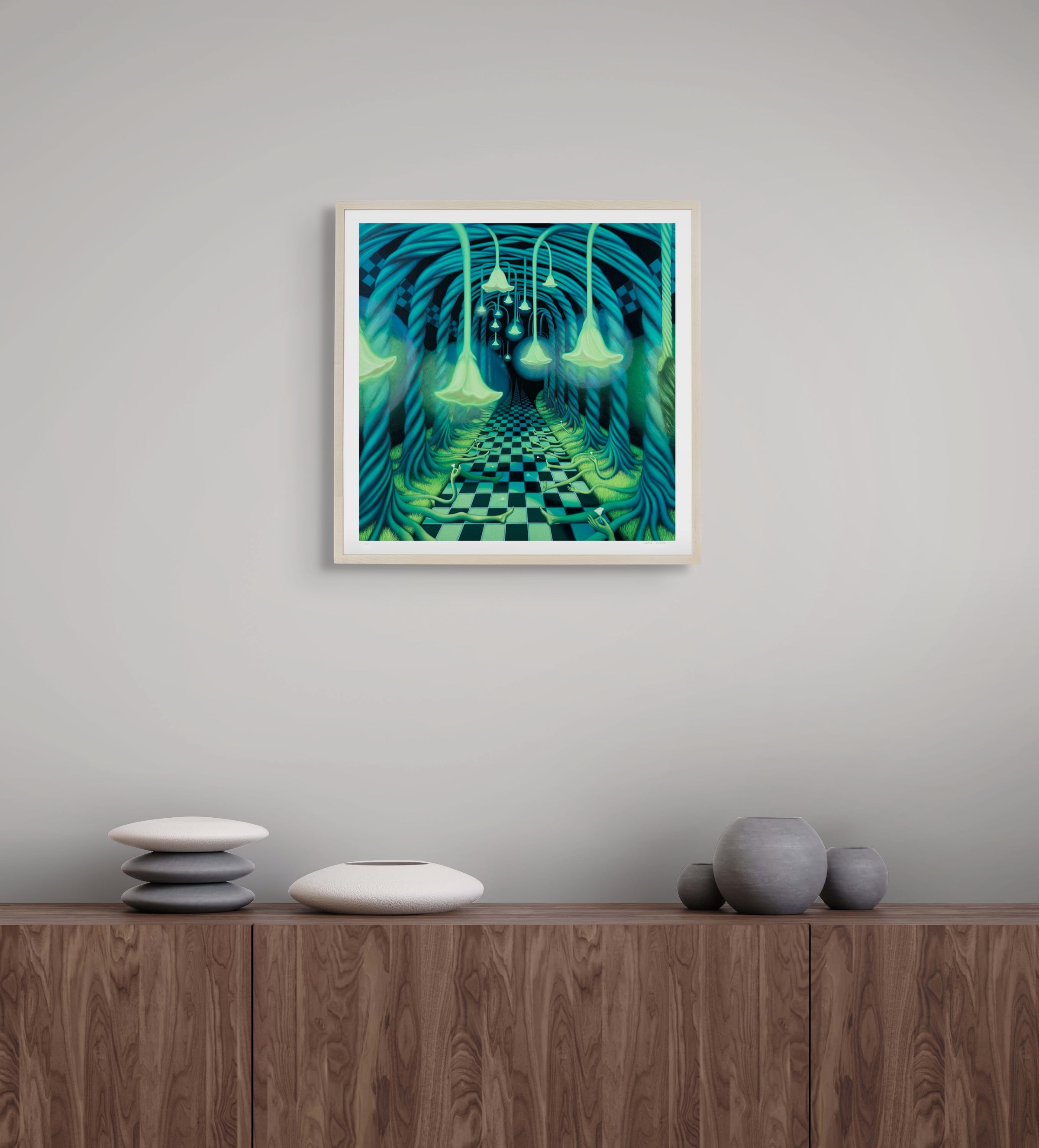 Space Bloom portrays a world in which trees and humans merge. Elongated limbs—bearing feet as well as hands that clutch tiny white flowers—twist upwards into curved tree trunks from which large, alien-like blossoms hang and glow. These trees frame a checked path that leads to a dark abyss, conveying a strange world that seems simultaneously natural and psychedelic. In reflecting upon her own work, Lifshin notes, “I am drawn to the tension between darkness and light, fear, and wonder, as well as the way beauty and emotional friction coexist. Nature remains a constant, active presence that shapes the figures and emotional landscapes that drive my work.” For this limited edition series, the artist will hand embellish each print with new details rendered with colored pencils and pastels.
