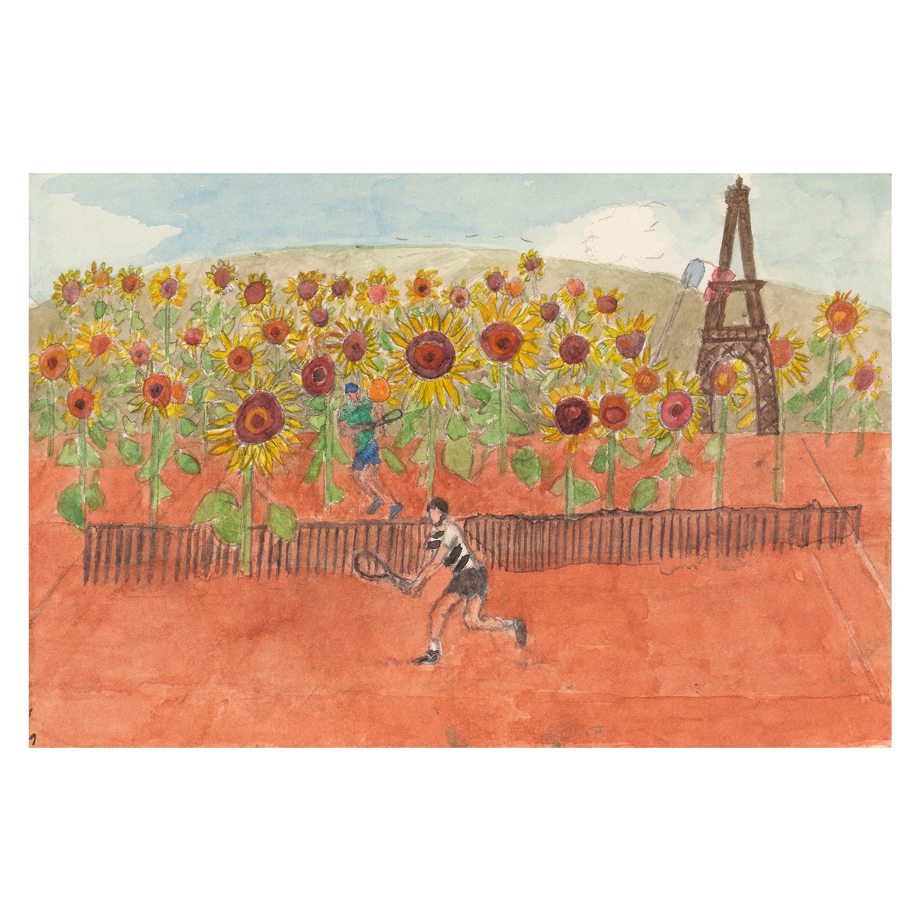 Shaun Ellison captures the essence of Paris while evoking the drama of the French Open final. In this piece, he creates a sense of expansive space within a compact format. Did Sinner get lost in the Sunflowers as he faced Alcaraz? Isn’t life bigger than a tennis court? The work weaves together the French flag and the Eiffel Tower, while drawing inspiration from Parisian masters Monet and Van Gogh, both of whom explored the rich symbolism of sunflowers.